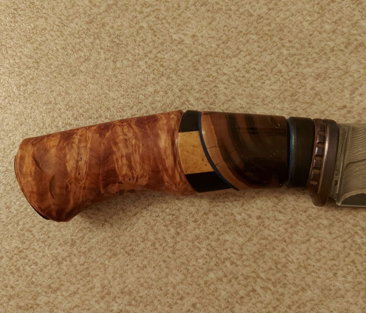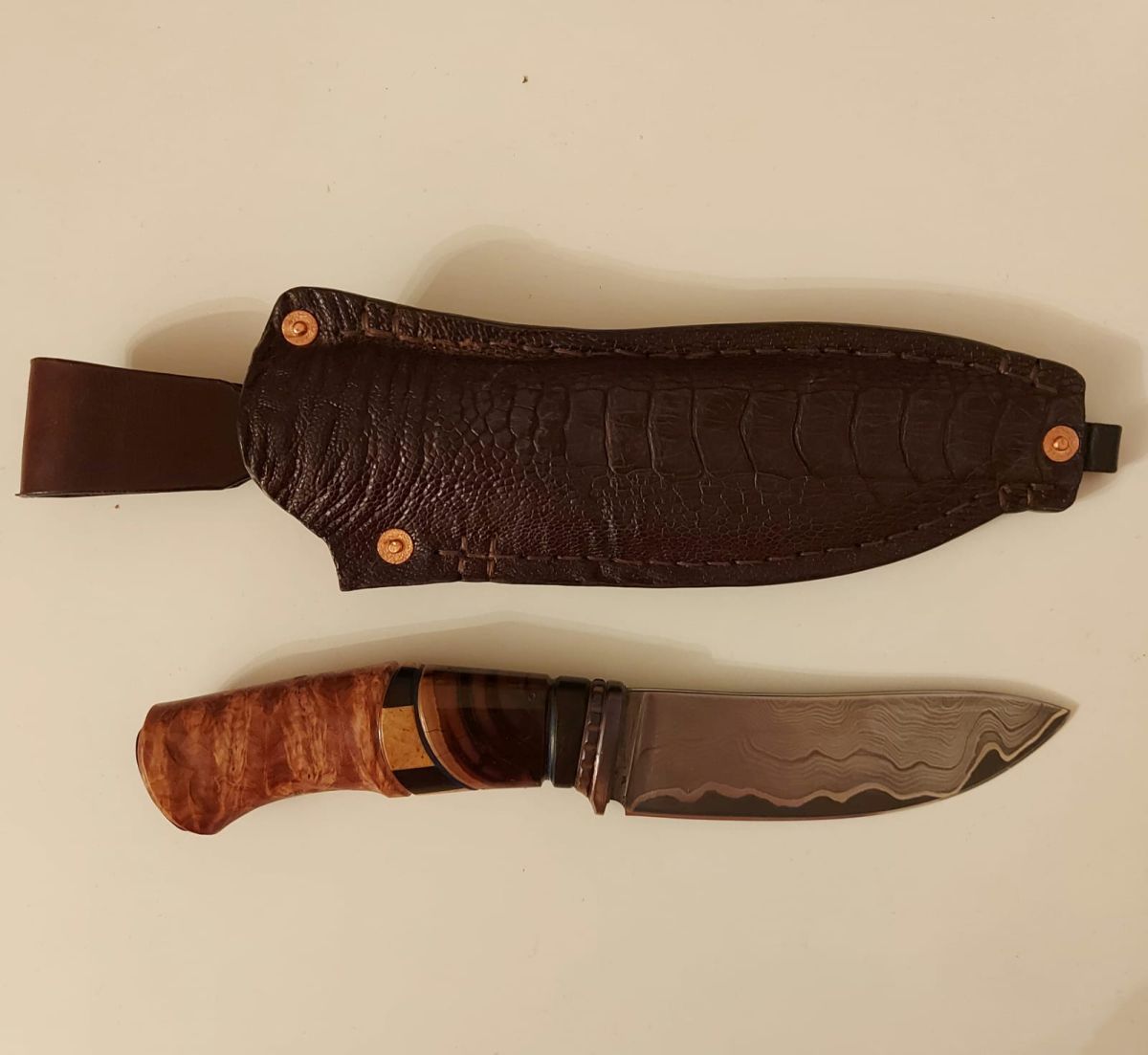 Центр ламинатного клинка QPM-53 об кладка нержавеющий ДАМАСК, твердость 65 Hrc, кузнец В. Потанин длина 115 ширина 35 толщина 3,8 сведение 0,4 спуски вогнутые материалы больстер ТИМАСКУС Пономареаых, рукоять КАП АМБОЙНА вставка бивень мамонта, цейлонский Эбен с вставками кость Стеллеровой коровы, ножны кожа юфть покрытая кожей голени страуса подвес свободный. Декларация: РОСС RU Д-RU.РА01.В.35992/24