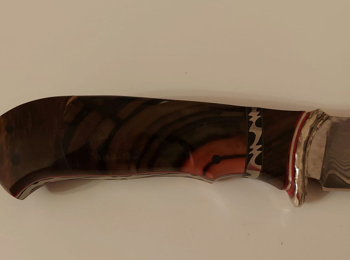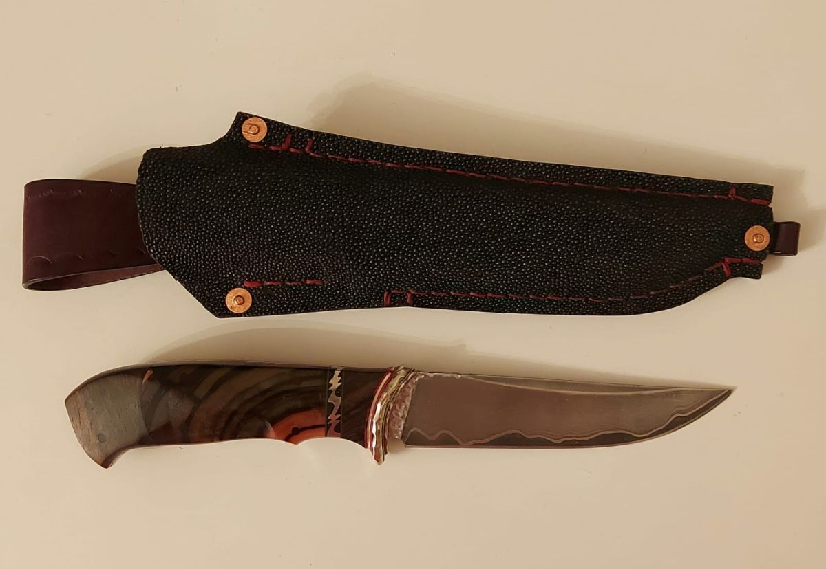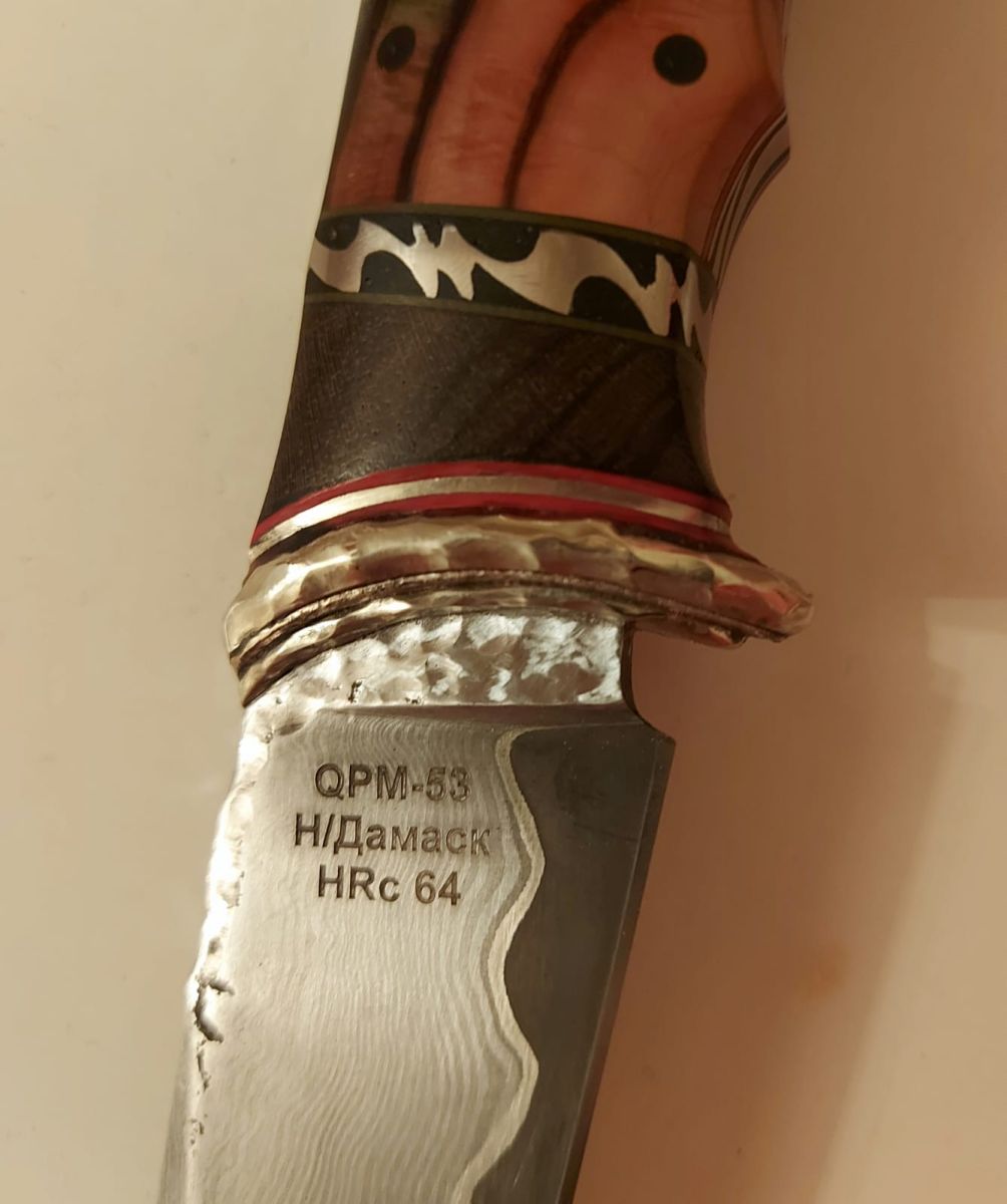 Центр ламинатного клинка QPM-53 об кладка нержавеющая ДАМАСК, твердость 65Hrc кузнец В. Потанин, длина 130,ширина 30,толщина 3,8 сведение 0,3 спуски вогнутые больстер многослойный мельхиор, рукоять титановая рамка и титановая муфта инкрустация файворк, накладки стабилизированный бивень мамонта комбинированный с деревом ЗИРИКОТ Ю. АМЕРИКА ножны кожа юфть обшита кожей морского ската, подвес свободный. Декларация: РОСС RU Д-RU.РА01.В.35992/24