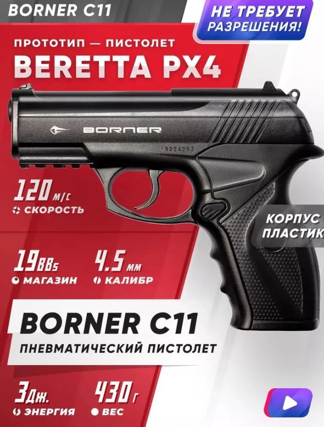 Пневматический пистолет BORNER C11 является прототипом известного боевого пистолета Beretta PX4.